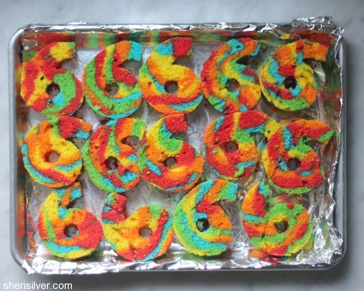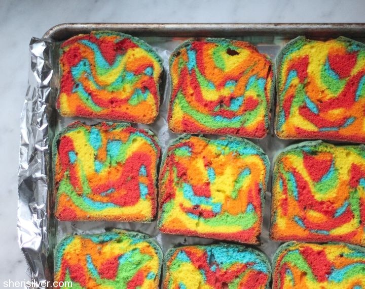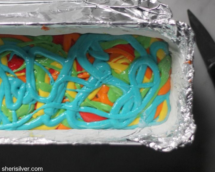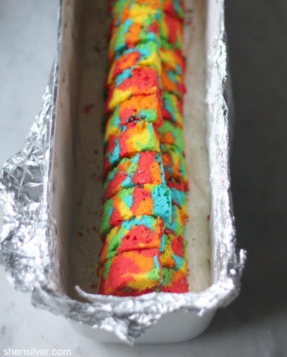 Divide the batter evenly into five bowls – tint the batter red, orange, yellow, green and blue. Transfer the batter into disposable pastry bags or zip loc bags. Alternating colors, drizzle the batter into your prepared pan. Tap the pan on the counter a few times to remove any air bubbles.