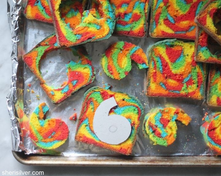 Cut the cake into 1″ thick slices – lay slices on a baking sheet and freeze for at least one hour. Using a stencil (either bought or homemade), cut your shapes out of the slices (you can freeze the scraps for snacking). Place the shapes back in the freezer.