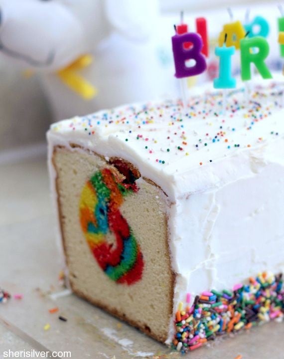 And then a Pinterest search led me to a photo of a plain white cake that – when sliced – revealed a hidden rainbow number.