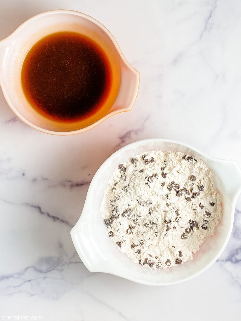 In a large bowl, whisk together the flour, baking powder, baking soda, and salt. Add the chocolate chips to the flour mixture and toss to coat. In a separate large bowl, whisk the sugars with the canola oil and water until smooth and incorporated, about 2 minutes (do not skip this step).