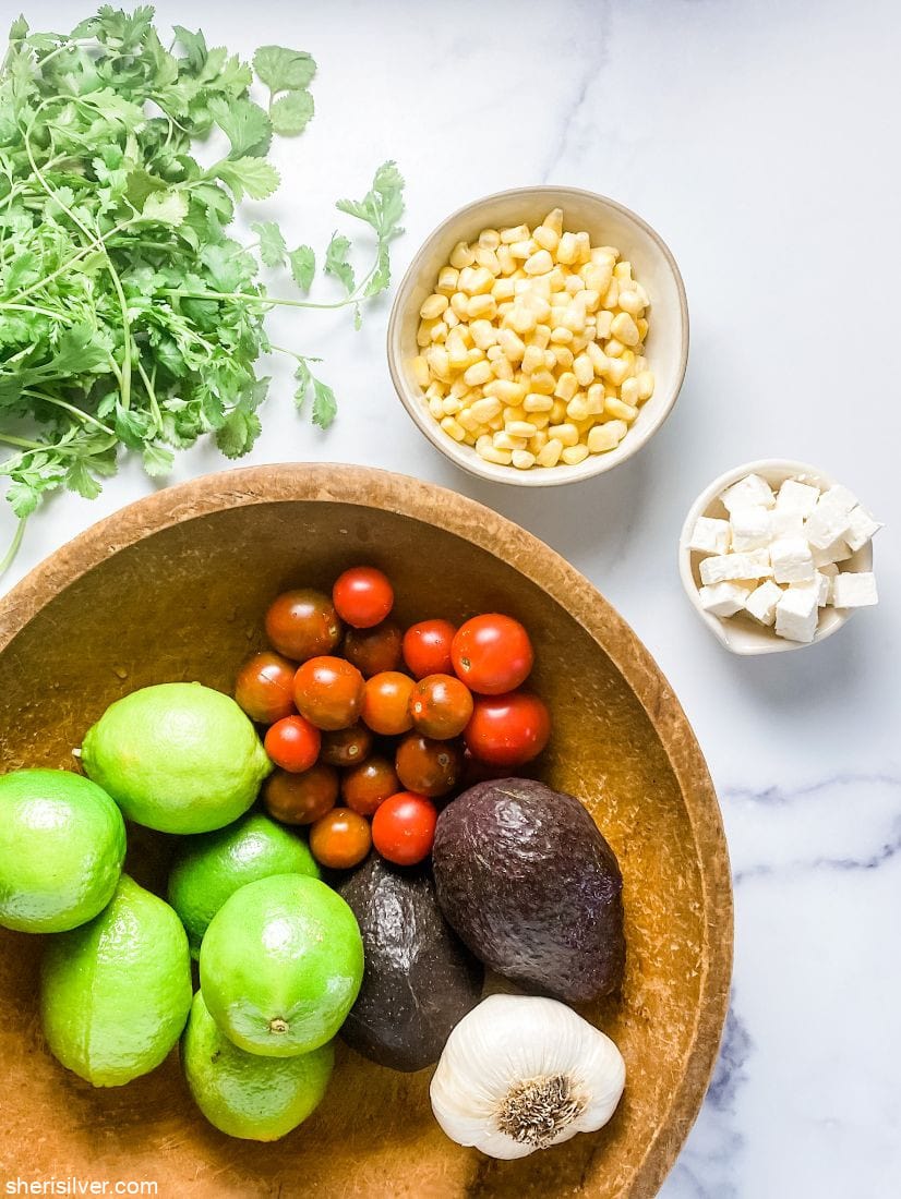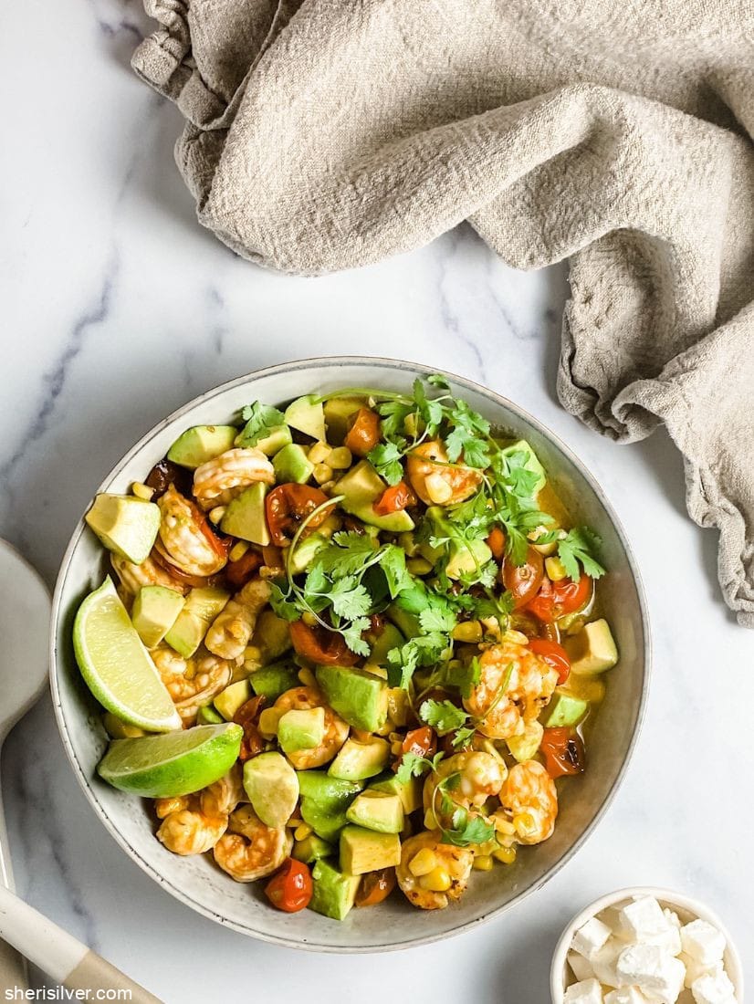 I used grape tomatoes and frozen corn, and sauteed them in a skillet to heighten the flavors a bit. After adding the shrimp I gave the pan a run under the broiler, to char everything just a little. I subbed cilantro for the basil, and good ole feta to accompany. A diced avocado and crunchy tortilla strips and summertime felt like it might just be almost here.