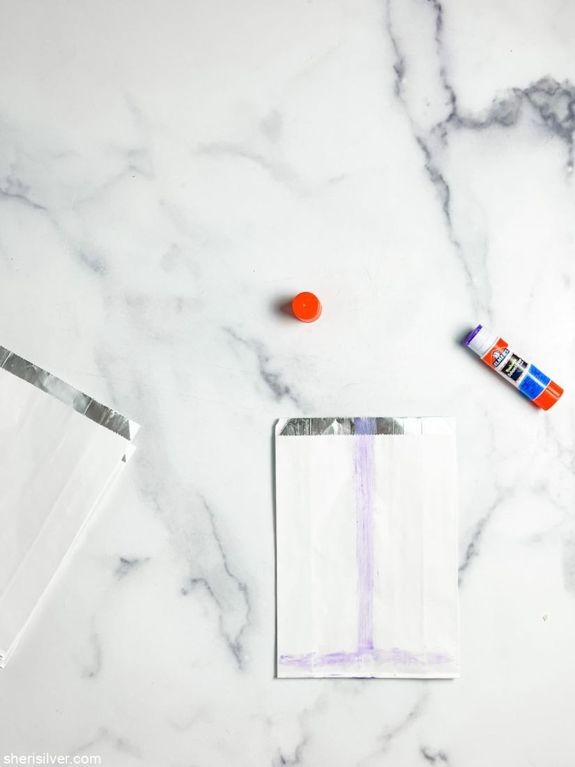 Start by using your glue stick to create an upside down “T” on one of the bags: