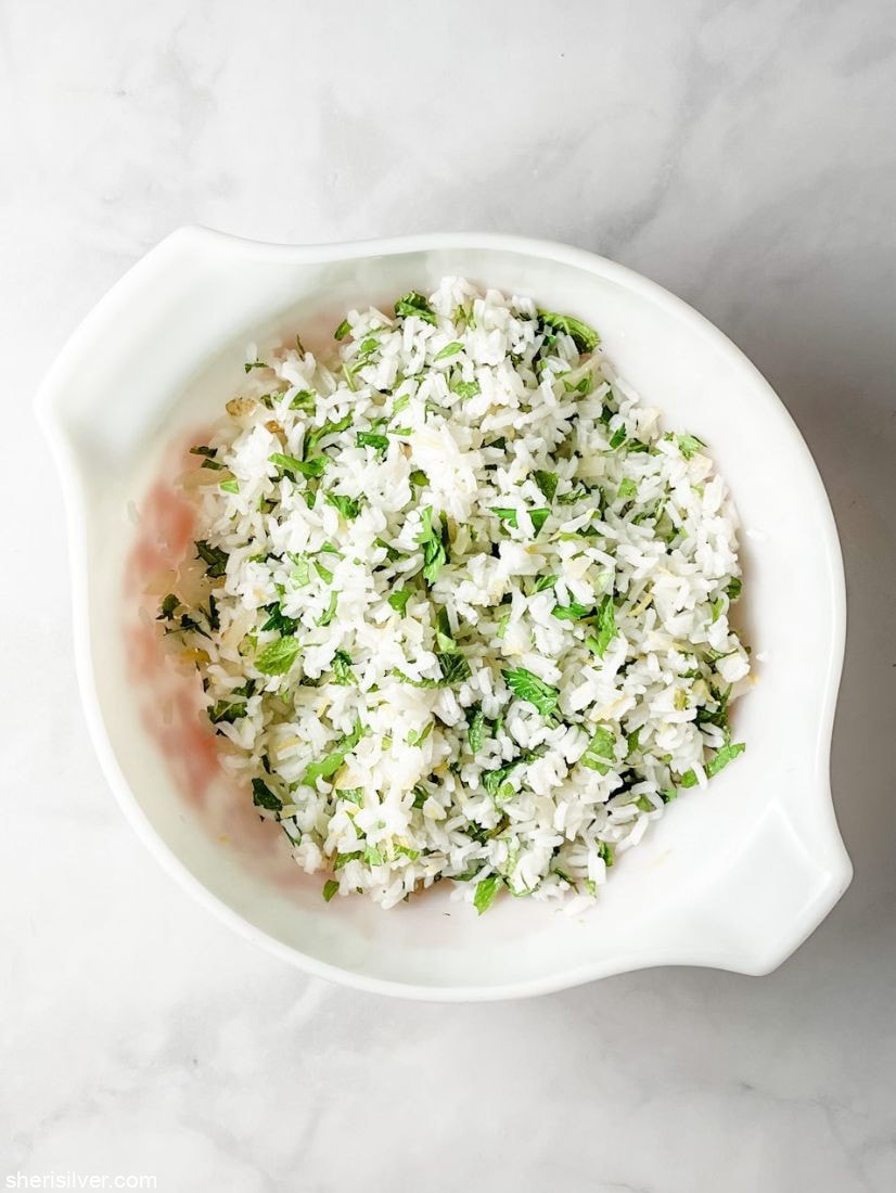 As I mentioned, much of this easy meal can be prepped early in the day, like marinating the shrimp and prepping/chopping the salad ingredients. You can also prepare the dressing ahead of time and keep in the fridge (just give it a shake before adding), and the rice can be served at room temperature!