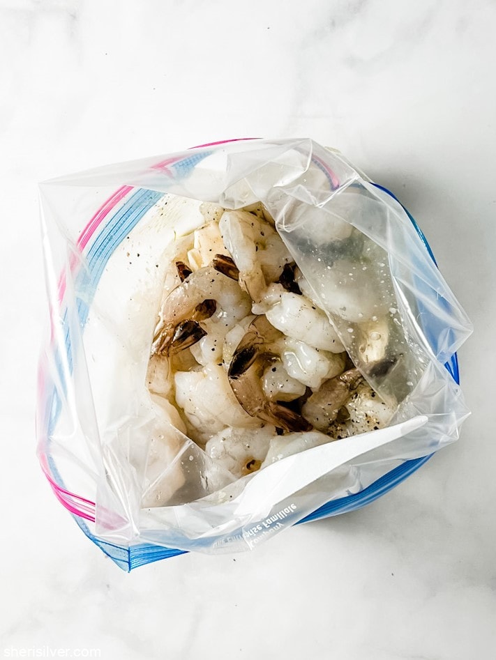 - Place the shrimp, 2 tablespoons of olive oil, garlic, 1/2 teaspoon of salt and black pepper in a large ziploc bag. Smush the bag to coat the shrimp and refrigerate for 30 minutes (or earlier that day).
