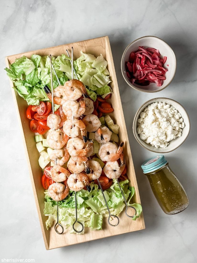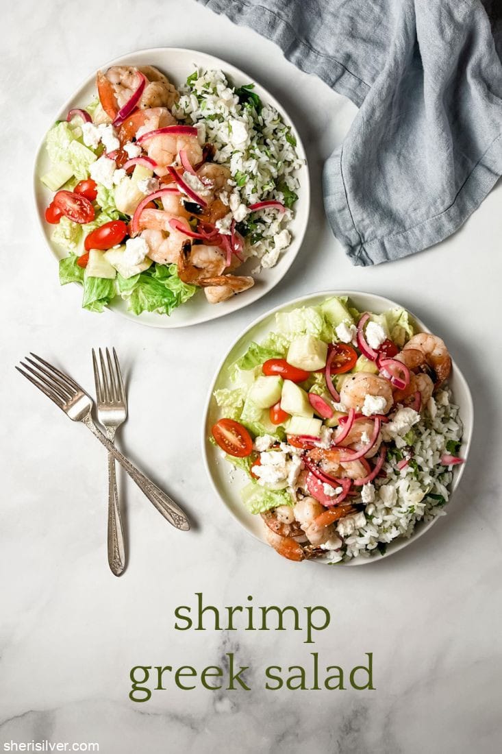 As the name implies, this is a main course Greek salad, consisting of chopped romaine lettuce, tomatoes and cucumber. It’s served with a lemon-mint jasmine rice and topped with broiled shrimp. I serve it with crumbled feta and sliced red onion!